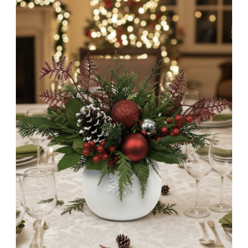 Fun holiday arrangement made to last! Fragrant winter greens, filled with ornaments, berries and all things christmasy! Perfect for holiday gifting.