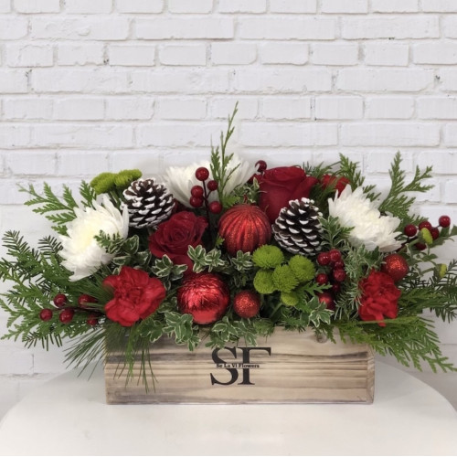 Our popular keepsake wooden box filled with lush Christmas greens, pine cones, berries, ornaments and seasonal flowers. Perfect for a centerpiece on the dining table.
