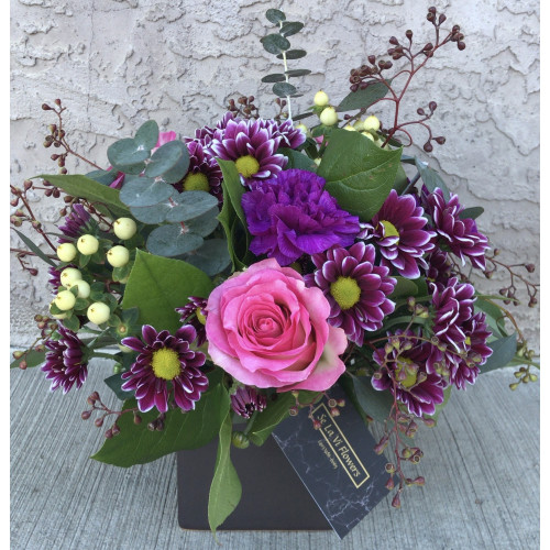 A lovely mix of our freshest purple and pink flowers arranged in a cubed vase. Perfect for a desk and/or coffee table!