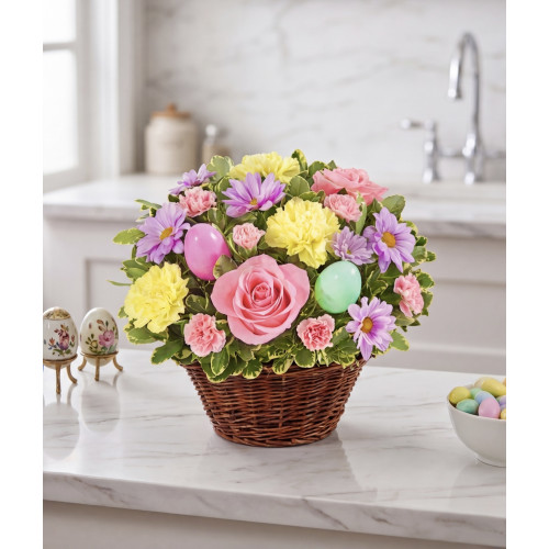 Pastel easter colours fill this basket with gorgeous seasonal flowers.